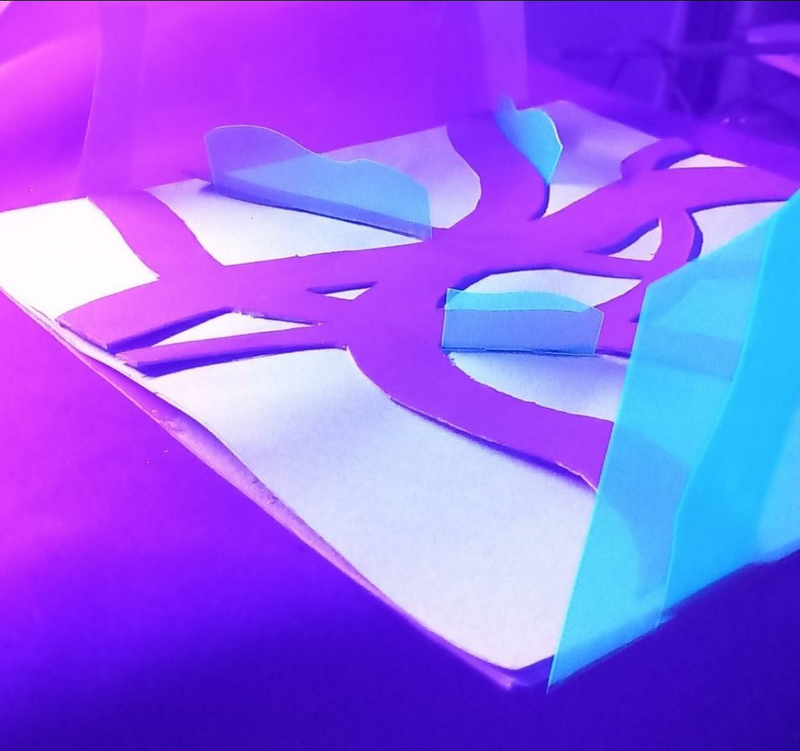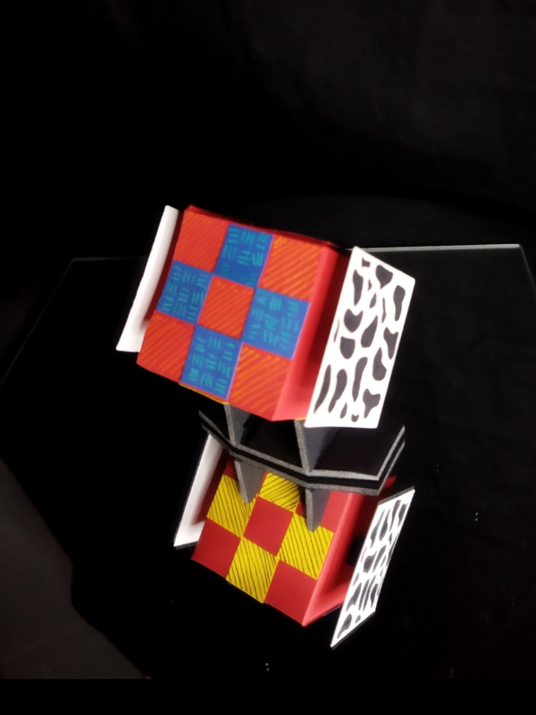 Voici le résultat d’un travail en trois étapes : après avoir inventé des motifs et découvert les trames graphiques, les élèves ont dû créer un petit travail en volume, à partir des réalisations graphiques précédentes. Leur réalisation devait avoir plusieurs points de vue, et jouer avec les pleins, les vides et la transparence.
